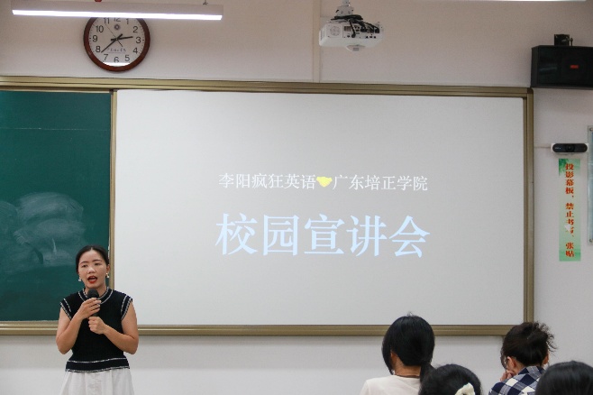 本网讯(外国语学院 林家圣)为引导学生深入思考就业方向,并为其提供宝贵的社会实践契机,2025年6月4日,李阳疯狂英语广东总校携手广东培正学院外国语学院,于第五教学楼201课室举办了校园宣讲会。