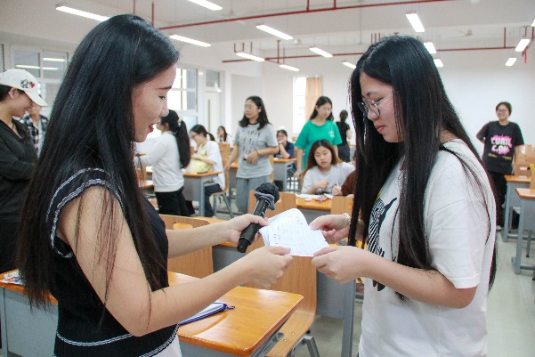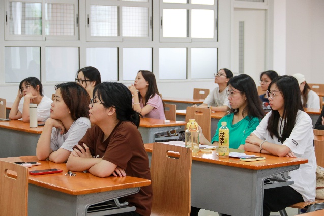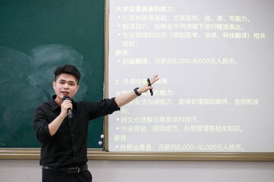 随着同学们入座后,宣讲会正式开场。Jackie老师首先进行了简要的自我介绍,随后通过对比外语专业不同的就业路径,向同学们深入浅出地阐述了教培行业的优势与市场现状。接着,Jackie老师全方位介绍了公司的工作氛围、薪资体系、岗位职责、职业发展空间、核心业务等内容。期间,播放的多段视频更是生动展现了李阳疯狂英语充满活力的企业文化,让同学们身临其境。