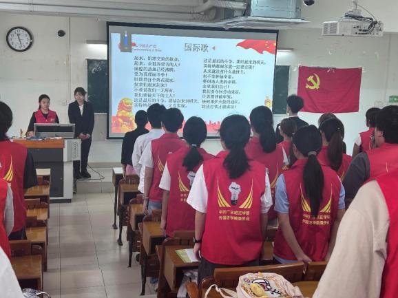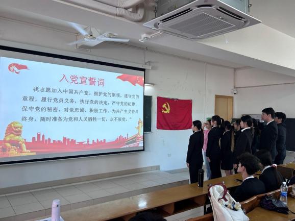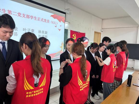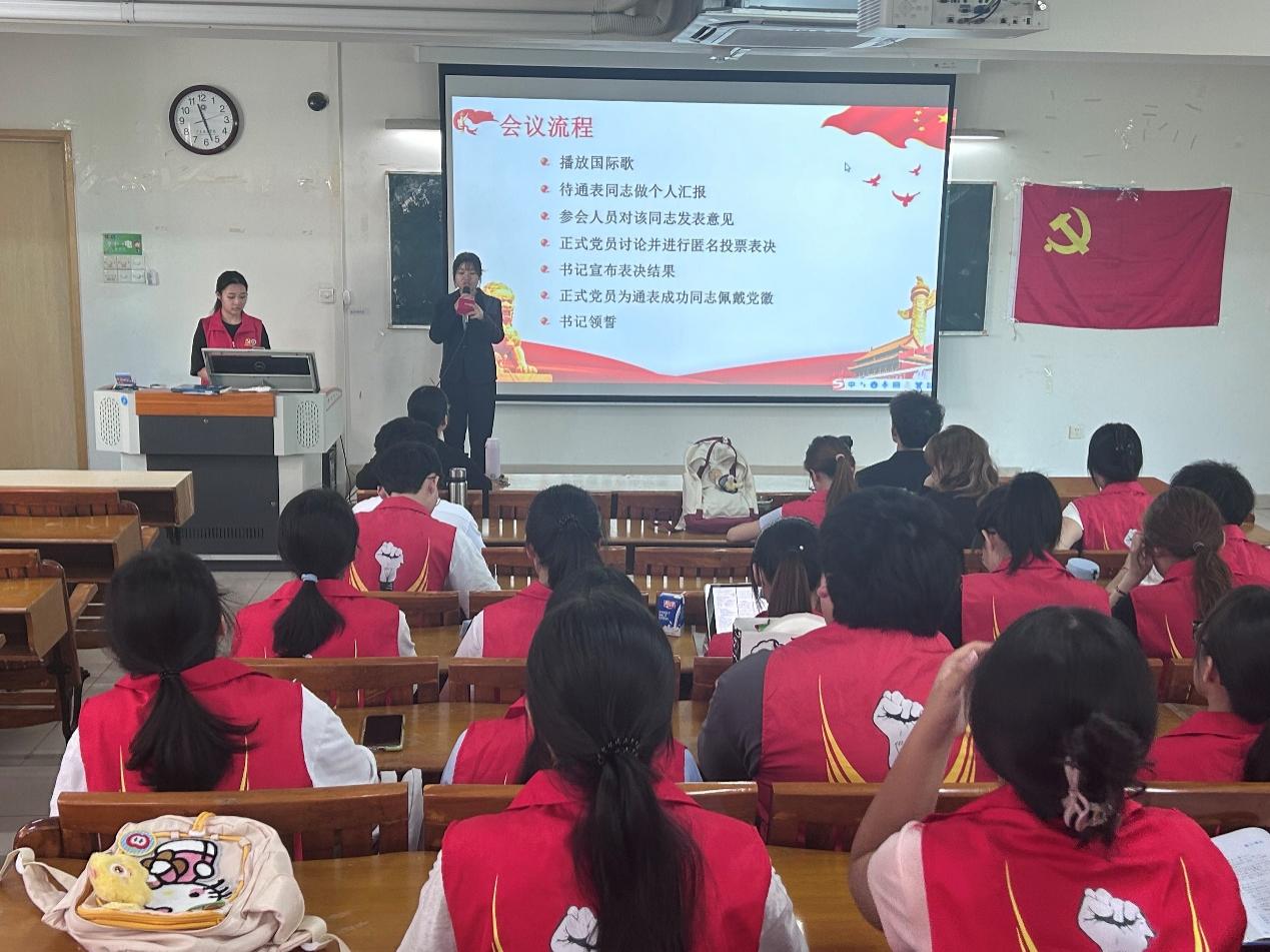 接下来,正式党员为通表成功同志佩戴党徽。随后,吕嘉欣书记领誓。宣誓时,他们的神态庄重而肃穆,脸上洋溢着坚定与自豪。