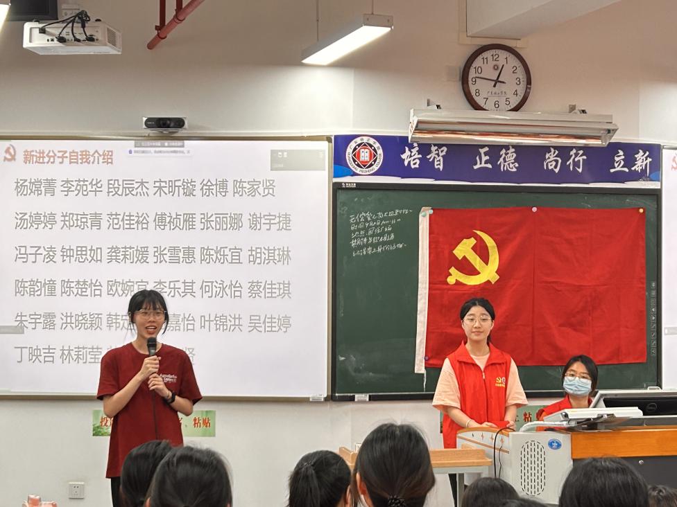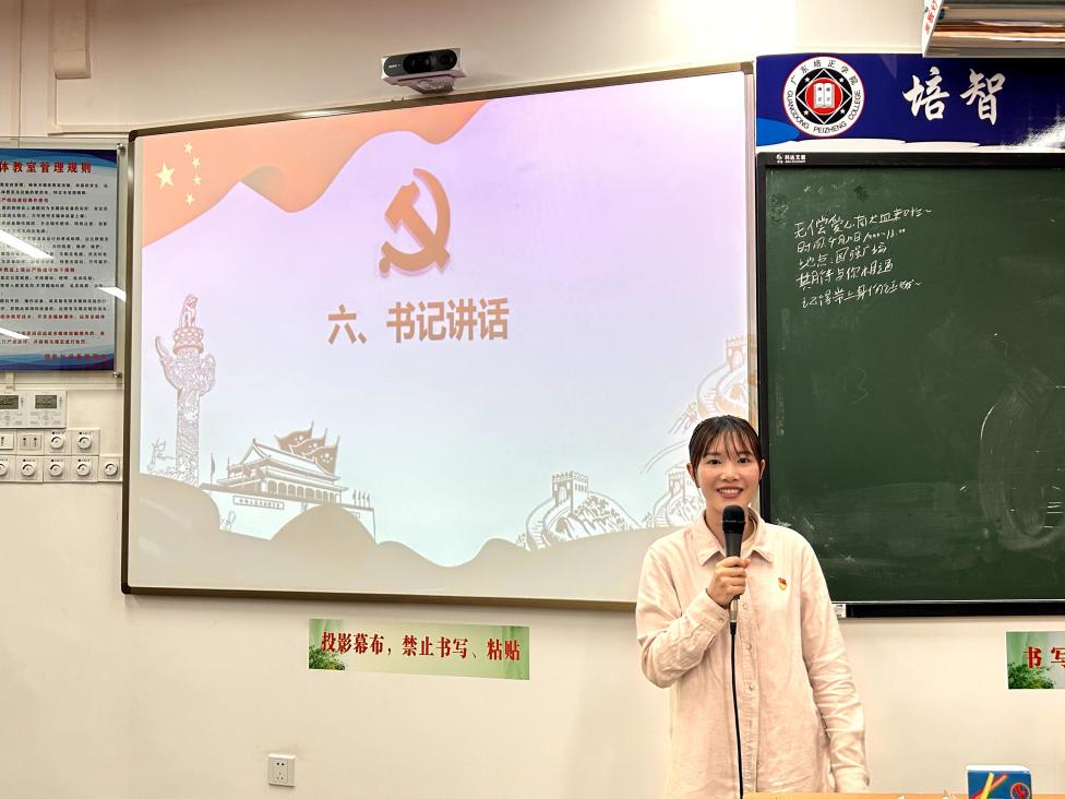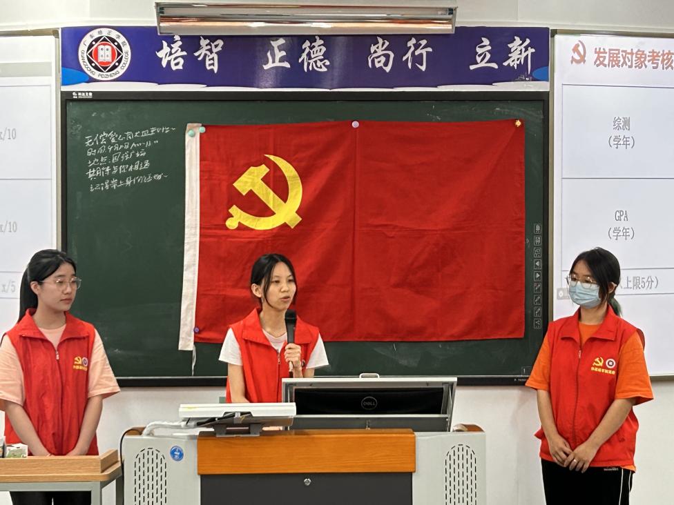 首先,组织委员彭彤彤同志对新进分子的加入表示热烈欢迎。紧接着,彭彤彤同志从支部的组织构建、成员情况、支部活动等方面进行介绍。健全组织生活,加强队伍建设,支部继续采用“三互小组”管理方式,将个人发展最大化、组织建设最优化。上学期,本支部积极开展了“我为群众办实事”系列志愿活动、特色党建活动、学科竞赛以及主题分享会等活动,进一步提高了支部同志们的积极性和政治理论水平。同时,彭彤彤同志也激励一支部的同志们要将理论联系实际,提升为人民服务的本领。