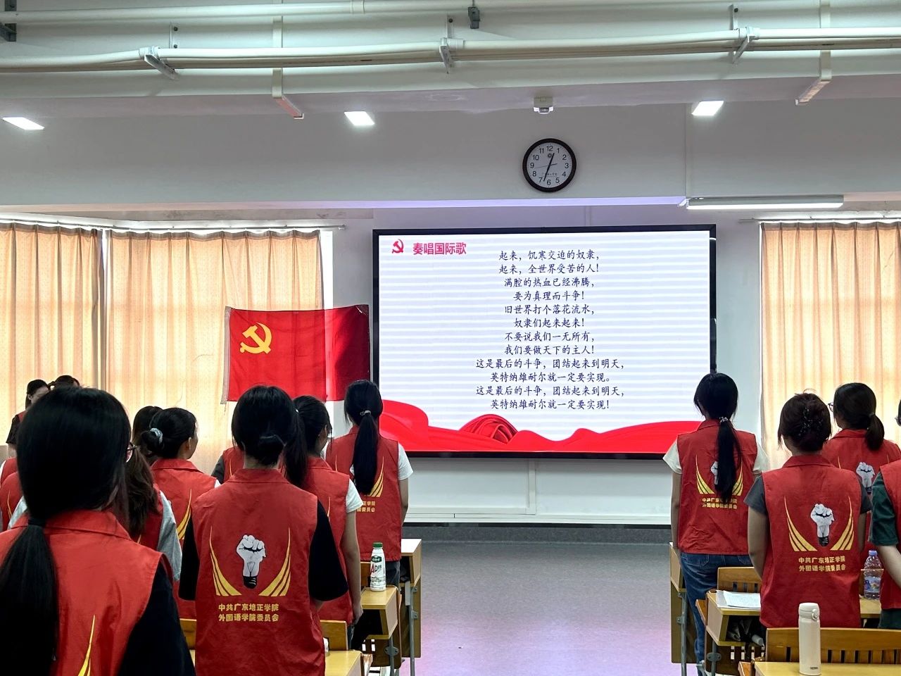 会议开始,全体起立奏唱国际歌。大家表情庄重,目光聚焦在前方。此时,国际歌的旋律缓缓响起,雄浑有力的歌声仿佛穿越时空,诉说着国际共产主义运动的伟大历程。随着国际歌的歌声渐渐落下,党支部的首次全体大会正式开启了各项议程。