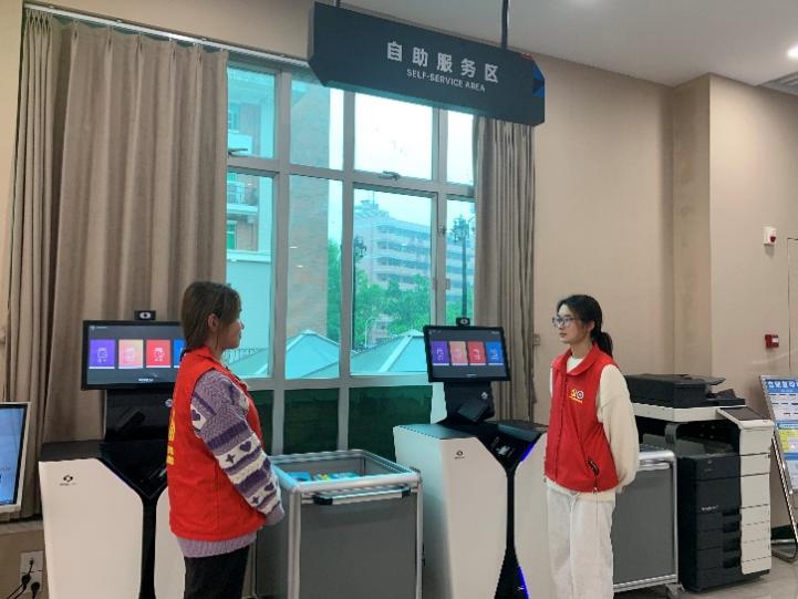 在图书馆一楼设有归还和借阅图书的机器。负责这一区域的同志指引同学们如何操作以及在线上进行浏览并下载书籍。