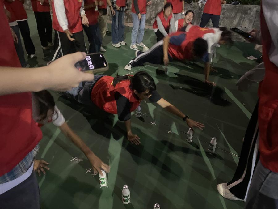 团队成员需要在不进入规定区域的情况下合作取出水瓶。可以借助队友的身体,但仅允许单手接触规定区域的地面。这项游戏极大的展现出成员之间协同合作带来的效果,众人拾柴火焰高,携手共进,贯彻了党的合作精神!