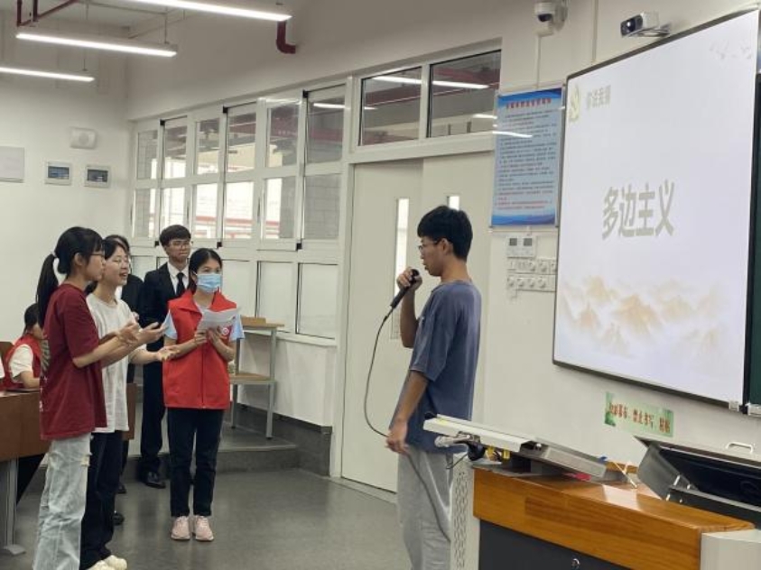 最后进行的环节“奋勇争先”——本环节采用“抢答”的形式进行。抢答成功的小组派代表进行回答,若小组代表回答正确,可积3分;若回答错误,则扣2分。可依次由下一个抢答小组进行回答,如未能回答出正确答案,则本题作废。本环节共8题。主持人介绍完规则后,宣布本轮比赛正式开始。随着问题的抛出,现场的气氛瞬间达到了高潮。选手们或是迅速抢答,争取第一个回答问题的机会;或是低头沉思,试图在脑海中搜寻正确的答案。他们的双眸闪烁着对比赛的专注,每一个细微的动作都透露出对胜利的渴望。