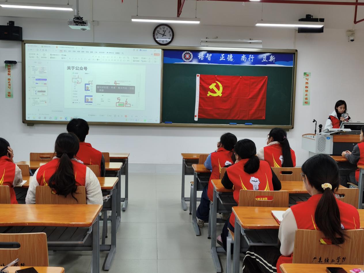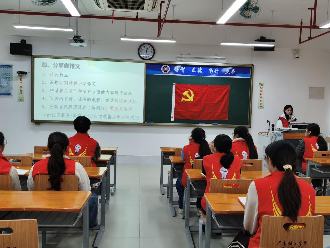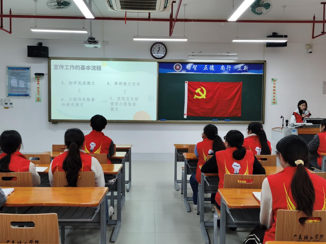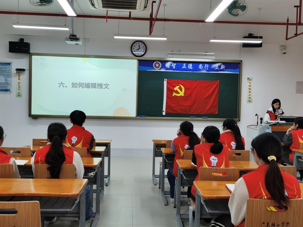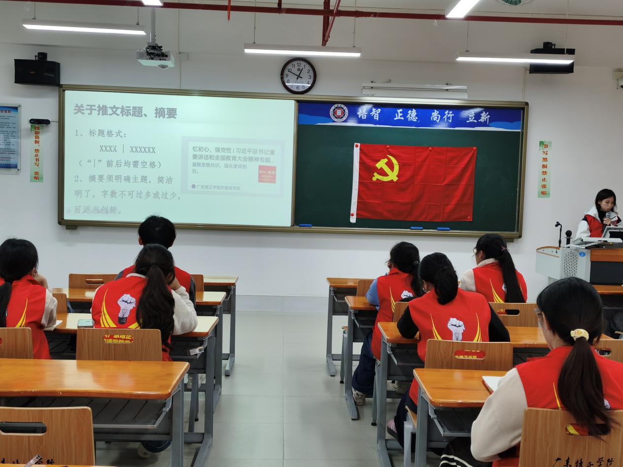 会议伊始,主持人梁绮烔同志为大家介绍了本次会议的流程:第一项是关于广东培正学院外国语学院公众号的介绍,第二项是拍摄注意事项,第三项是如何撰写通讯稿,第四项是分组及常规管理,第五项是“宣传两星”评选要求,第六项是如何编辑推文。