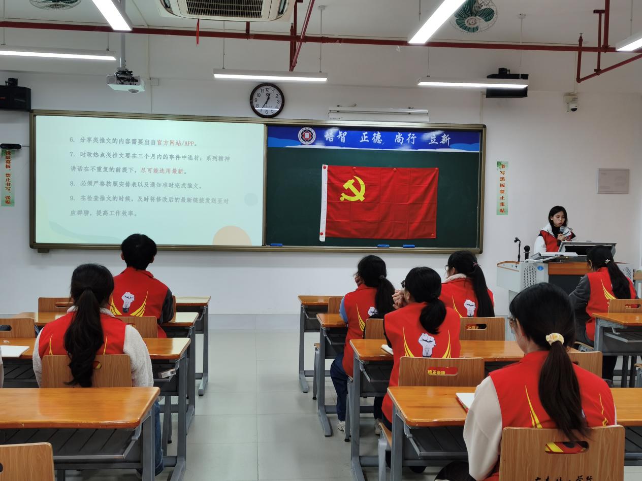 此外,梁绮烔同志补充说明了,每学期以及放假期间,每个小组都会分到推文任务,须根据分组安排来撰写推文;放假期间的推文任务以通知为准;须严格按照宣传小组的安排表以及通知及时完成任务;修改后的最新链接要发送至对应群聊,提高工作效率。随后,梁绮烔同志还详细讲解了通讯稿的格式要求。