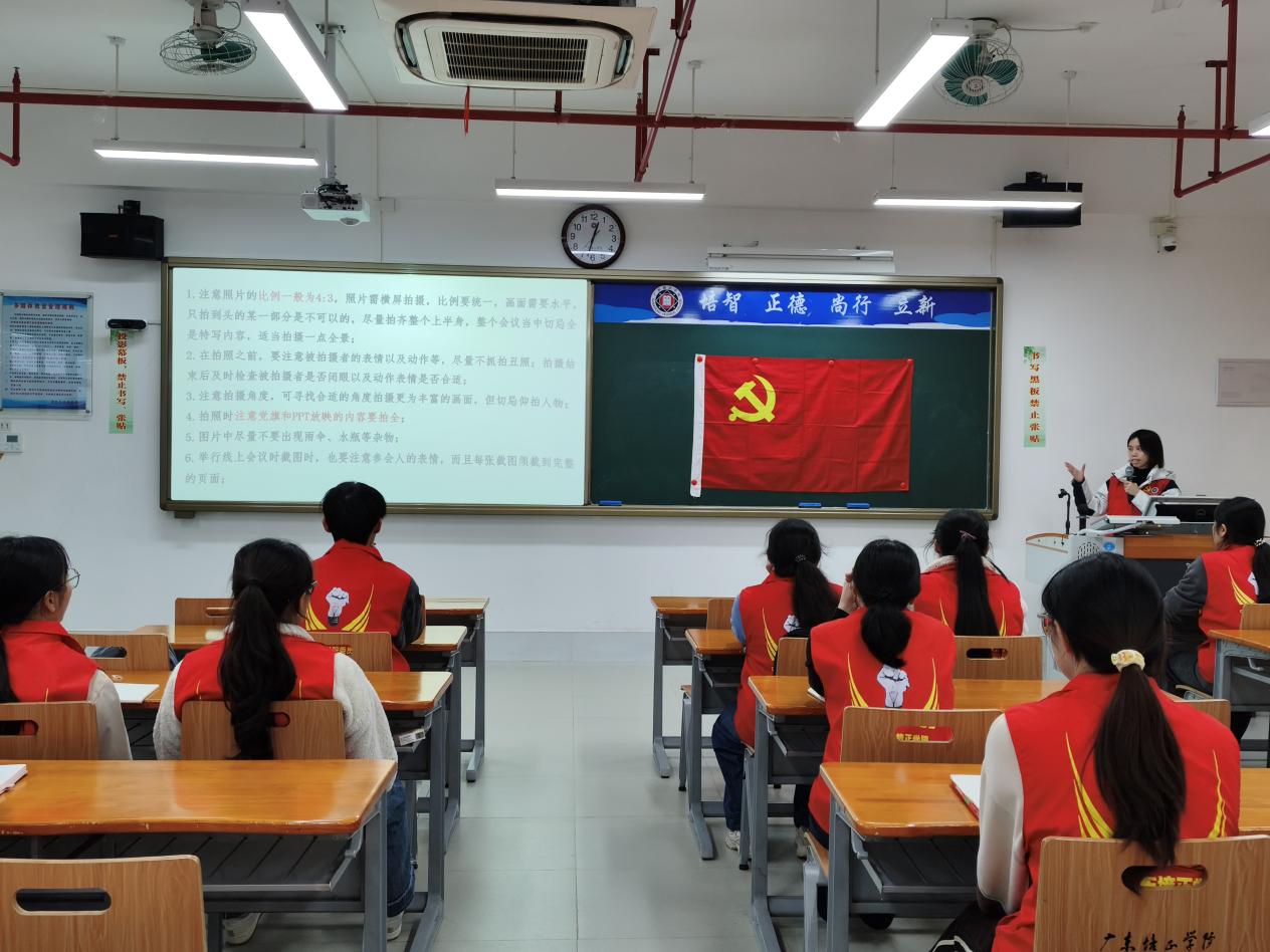 会议第二项,拍摄注意事项。梁绮烔同志强调了支部会议与活动的拍照比例须为4:3,同时拍照时尽量拍全身,不要抓拍他人丑照;拍照时要注意拍全PPT内容以及党旗,尽量不出现水杯等杂物;此外如果举行线上会议,截屏时要注意参会人的表情,以及内容的完整性。