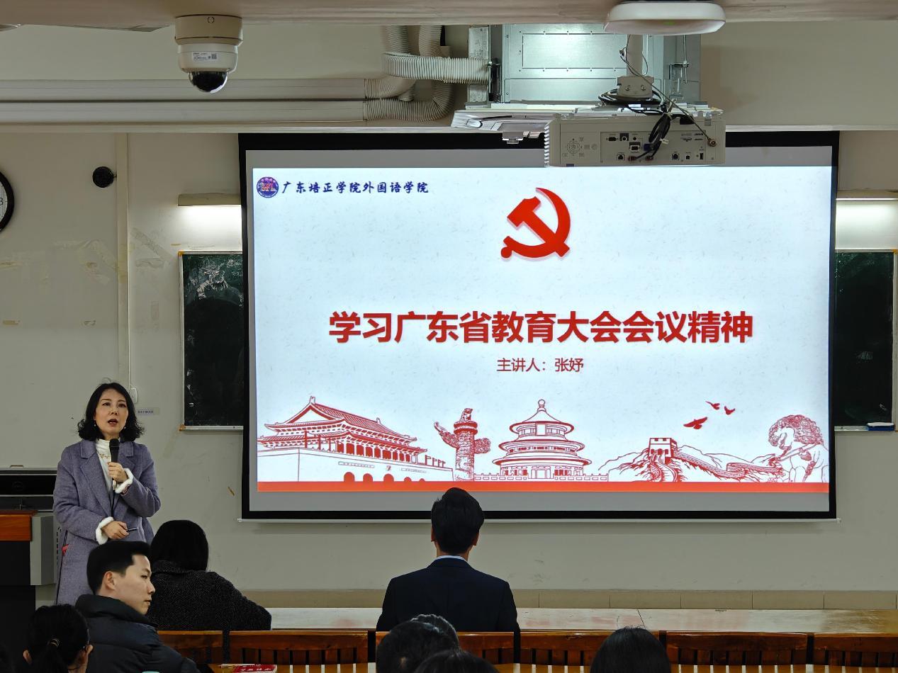 会上,张妤书记带领全体教工党员学习会议内容和精神,重点学习了“锚定建设教育强省目标,走好走实中国特色社会主义教育发展道路,以教育现代化走在前列支撑广东在推进中国式现代化建设中走在前列”等核心内容,强调要深刻领会,牢记为党育人初心,坚守为国育才立场,切实把思想和行动统一到习近平总书记、党中央决策部署上来,结合学院外语学科特色,深化课程思政改革,加强高素质专业化教师队伍建设,为广东教育强省建设贡献力量。