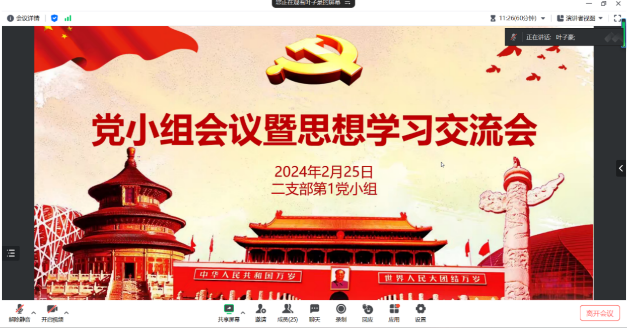 外国语学院学生第一党支部第一党小组于2024年02月25日20:00以线上会议的形式召开了二月份党小组会议。本次党小组会议,同志们深刻地学习到以人民为中心的导向创作的意义,作为新时代的党员要以人民为导向,关注民情;通过文化建设,大力宣传优秀文学作品,弘扬民族传统文化。会议上各位同志就三互小组活动策划的进度及遇到的困难互相交流探讨,各位同志都认真思考存在的问题并积极建言献策。