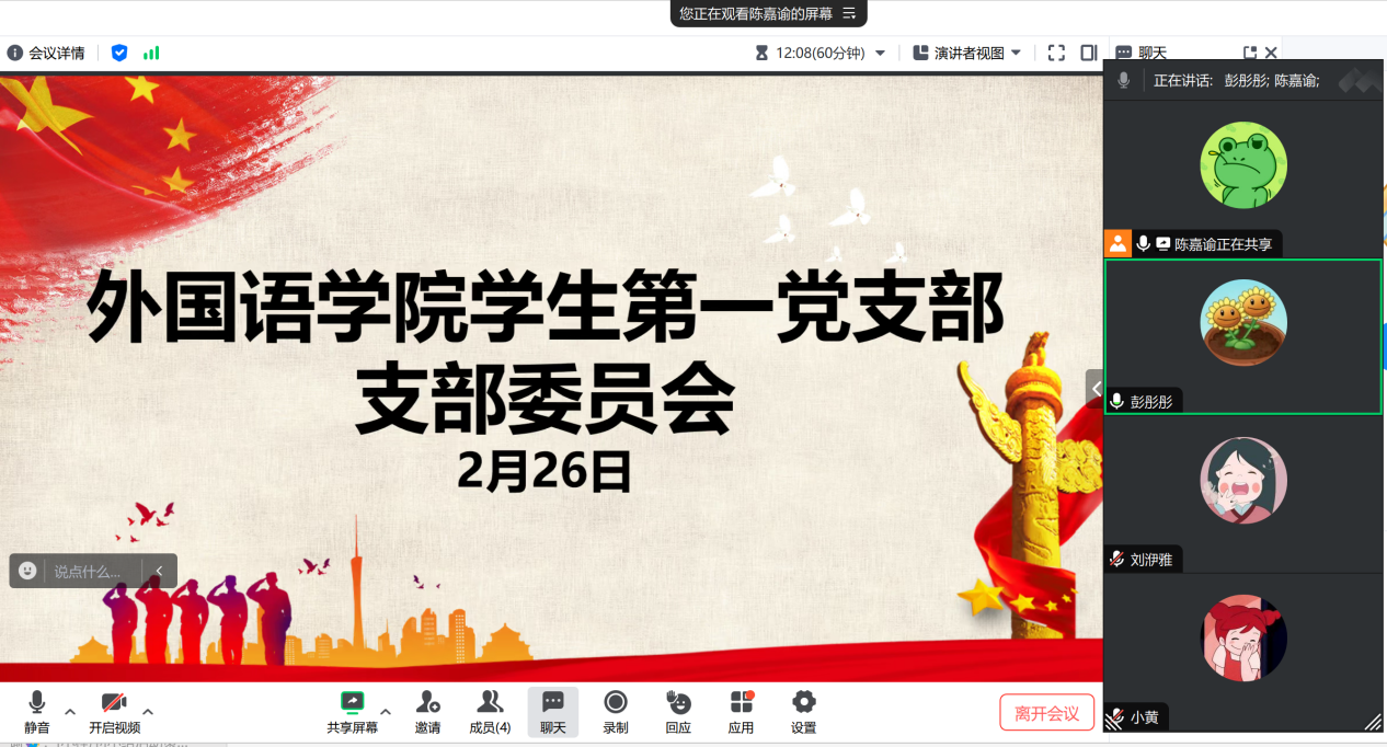 为配合支部工作开展,提前做好新学期工作安排,外国语学院学生第三党支部于2024年02月21日19:30以线上会议的形式召开了支部委员会议。本次会议以“学习贯彻习近平新时代中国特色社会主义思想主题教育工作会议上的讲话”为主题,在会议的前半段深入了解了习近平总书记对广大青年的殷切嘱托,同时对会议上强调的重要思想进行学习;其次,在会议上,支部委员们就新学期活动安排与书记进行沟通,一起明确新学期的工作任务和目标,做好开学前的准备工作并处理好相关事务;最后,对会议内容进行查缺补漏,各委员针对支部相关组织工作进行商讨,对经费安排以及下学期的重要活动有了充分认识,李雪书记强调要继续互帮互助、调动支部成员的积极性、完善工作中的不足,携手并进推动支部发展。