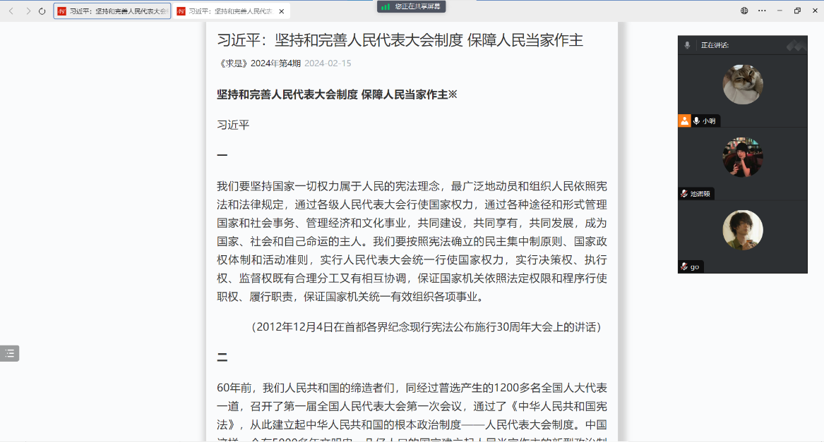 为学习贯彻习近平:坚持和完善人民代表大会制度 保障人民当家作主的重要论述,外国语学院学生第二党支部于2024年02月28日15:00以线上会议的形式召开了支部委员会议。本次会议盛苗书记带领委员们学习近年来习近平总书记对于人民民主的相关论述,也使各委员深刻明白人民代表大会制度的重要性。