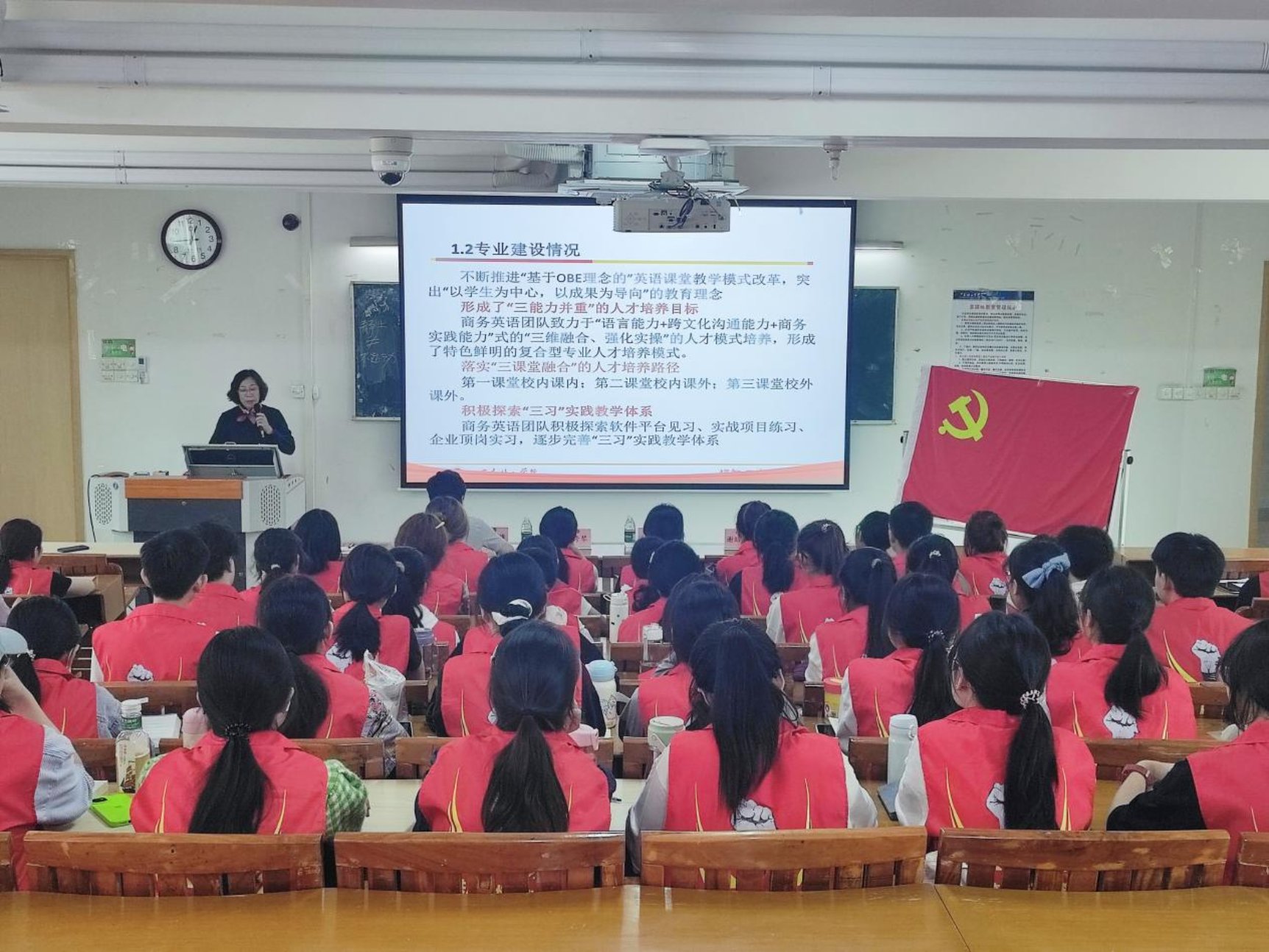 院长第一课上,战秀琴院长以“自信自强,放飞理想”为主题向同学们讲解了外国语学院学科建设、专业建设、课程建设的情况,介绍了“‘三能力(语言能力、跨文化沟通能力、商务实践能力)并重’的人才培养目标、‘三课堂(第一课堂校内课内、第二课堂校内课外、第三课堂校外课外)融合’的人才培养路径、积极探索‘三习(软件平台见习、实战项目练习、企业顶岗实习)’实践教学体系”的教学特色。