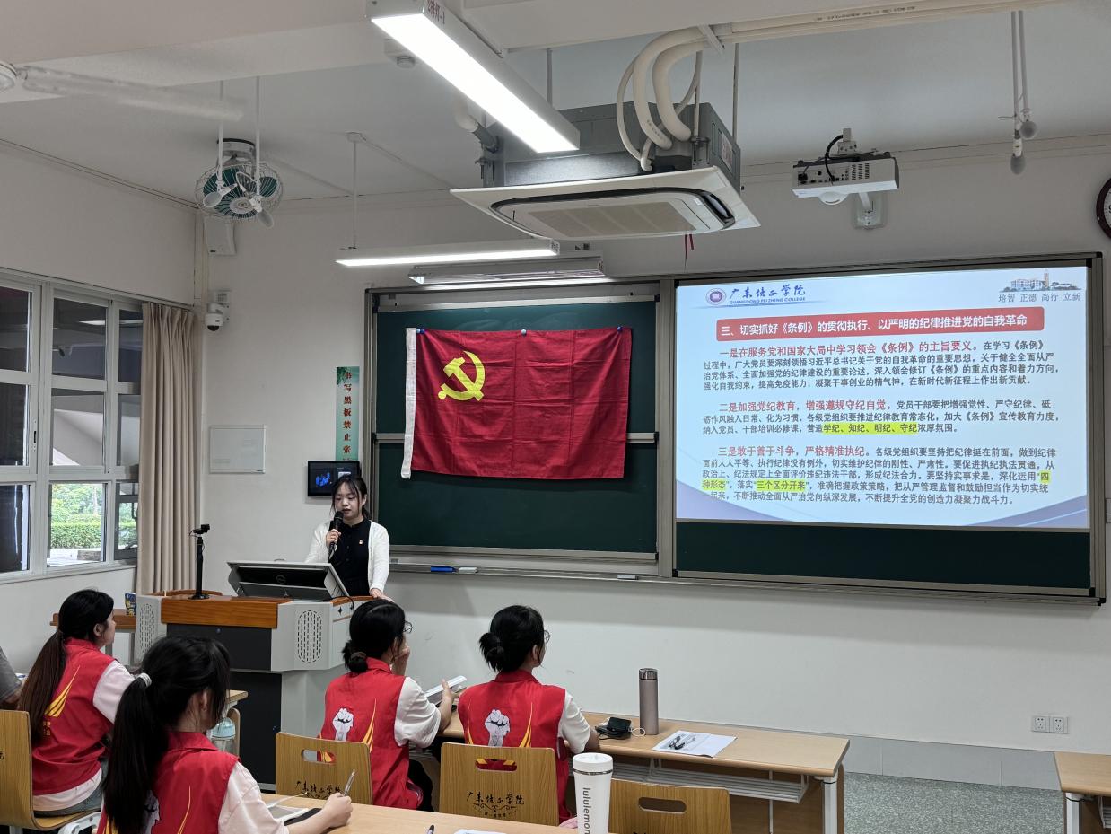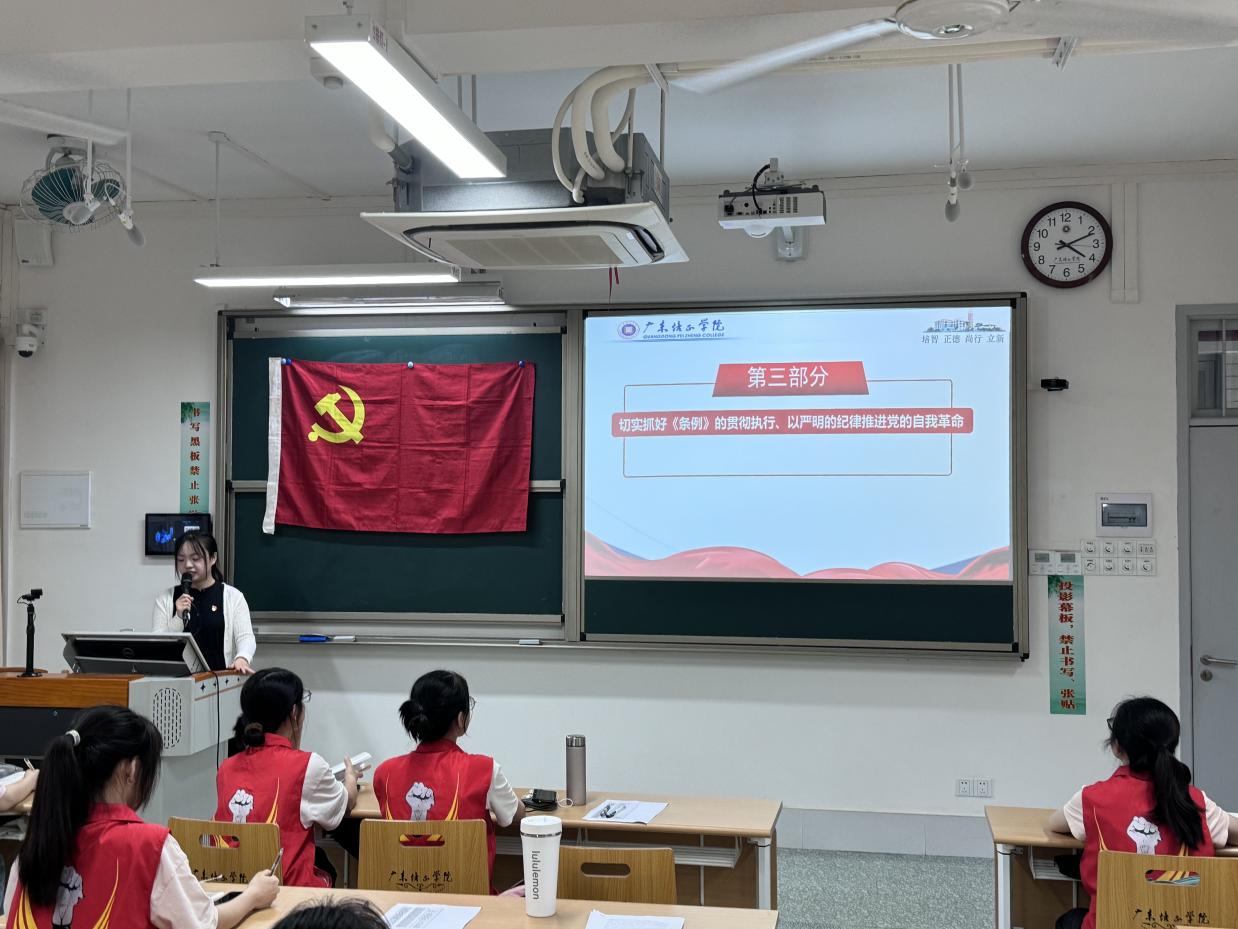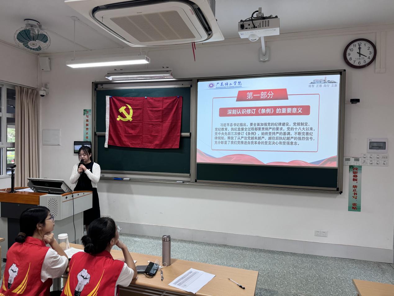 紧接着,李雪书记分点说明新修订《中国共产党纪律处分条例》的相关内容。根据党的纪律种类——政治纪律、组织纪律、廉洁纪律、群众纪律、工作纪律以及生活纪律这六个方面展开讲解。国有国法、家有家规、校有校纪,党也自然有党的纪律,书记通过列举实际生活中的例子加深党员们的印象,提醒党员们需要提高思想意识,自觉遵守行为准则;时刻约束自身行为,用党员的标准严格要求自己,发挥出党员的先锋模范作用。