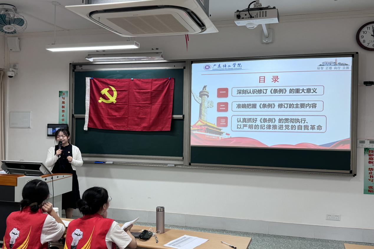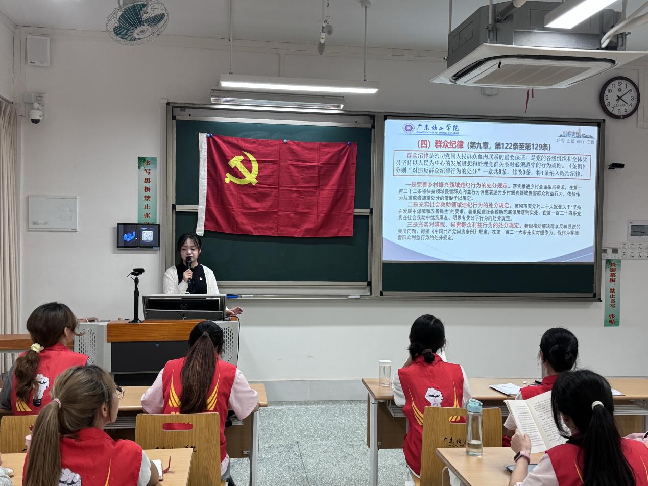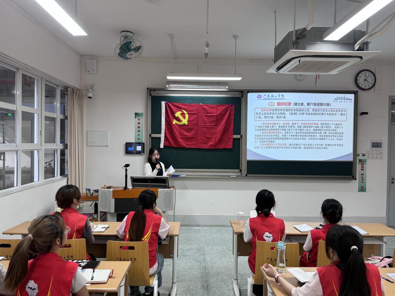紧接着,李雪书记分点说明新修订《中国共产党纪律处分条例》的相关内容。根据党的纪律种类——政治纪律、组织纪律、廉洁纪律、群众纪律、工作纪律以及生活纪律这六个方面展开讲解。国有国法、家有家规、校有校纪,党也自然有党的纪律,书记通过列举实际生活中的例子加深党员们的印象,提醒党员们需要提高思想意识,自觉遵守行为准则;时刻约束自身行为,用党员的标准严格要求自己,发挥出党员的先锋模范作用。