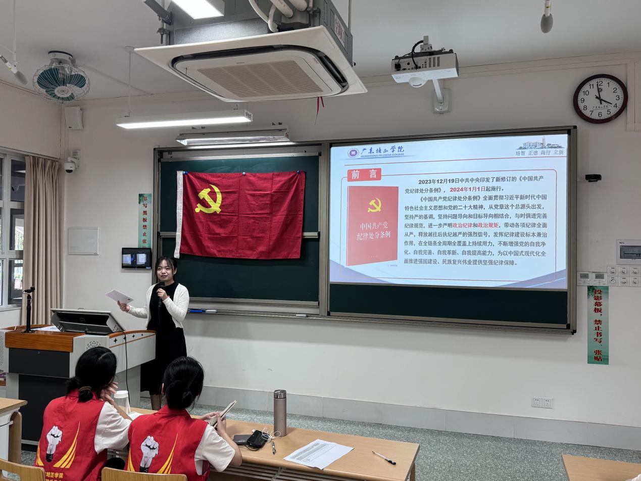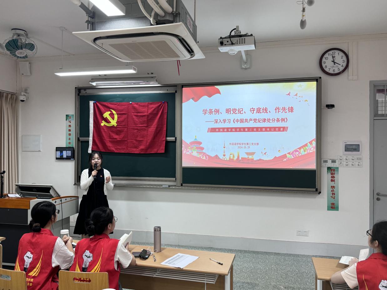 本网讯(外国语学院 戴碧珊)为推进党员党纪学习教育,学习习近平总书记的重要指示精神,外国语学院学生第三党支部于2024年05月29日16:00在第一教学楼106教室开展“学条例,明党纪,守底线,做先锋”专题党课学习。引导党员同志们明晰纪律规定,守住底线意识,发挥先锋模范作用。参与本次党课学习的人员有:李雪书记和全体党员同志。