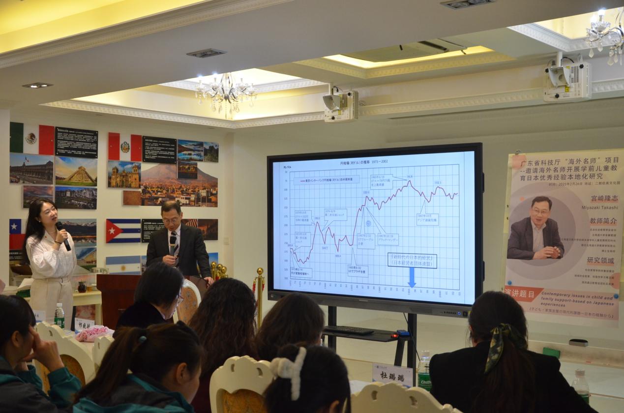 本网讯 (外国语学院 刘榕)瑞蛇送暖,名师领航,2月26日下午13:30,日本著名学者宫崎隆志(Miyazaki Takashi)教授于二教欧美文化园顺利举办题为《Contemporary issues in child and family support-based on Japanese experiences》的讲座。此次讲座系广东省科技厅“海外名师”项目——邀请海外名师开展学前儿童教育日本优秀经验本地化研究落地活动之一。宫崎隆志教授,日本社会教育学会会长,现任北海道文教大学教授、大学院儿童发展学研究科科长,研究领域涵盖地域社会教育、创造性学习等主题,研究专长包括社会教育学和学童保育论,在家校共育、学童保育、终身学习研究方面颇具影响。参会的还有学者和教授包括佛山大学学前教育系主任、佛山市学前教育学会会长钟媚教授、日本北海道大学祁晓航博士、广州市花都区儿童发展发展研究院心理教研员周虹老师、外国语学院院长张妤副院长,学前教育系系主任许欢、日语系系主任杜璐璐及学院师生共同参加外,还特邀广州市花都区水晶幼儿园园长罗永生及骨干教师齐聚一堂,共同了解日本学前教育的发展趋势,探讨面临少子化困境下学前教育发展如何应对的策略。