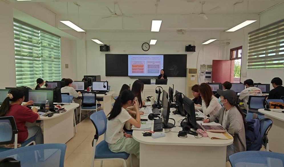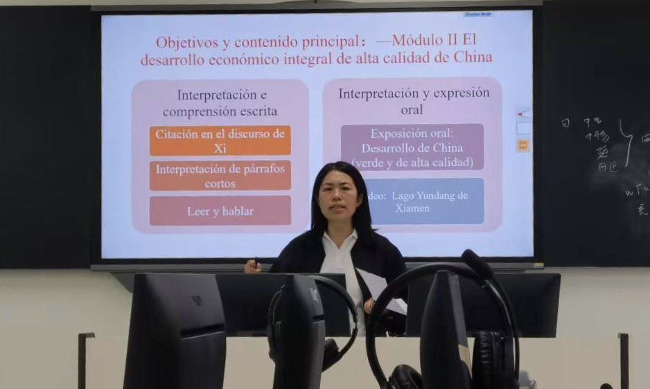 本网讯(外国语学院 亢俊洁)在教育教学不断探索与创新的过程中,西班牙语系黄伟老师于2025年4月15日下午,在三教3603举办了《西班牙语口译》观摩课,此次观摩课围绕《理解当代中国・西班牙语演讲教程》第二大模块“中国全面高质量经济发展”展开。