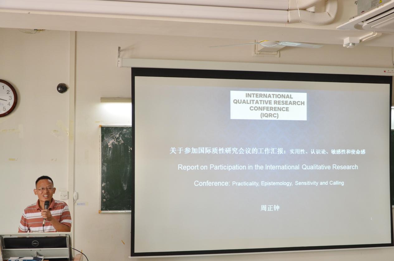 首先,周正钟老师以《Practicality, Epistemology, Sensitivity, Calling》为题,对其在马来西亚参加“国际质性研究会议”的收获进行了全面细致的汇报。在此次会议当中,周老师深入地探讨了定性研究的一系列相关问题。其中,涵盖了研究的精准定义、多样化的方法,并且还包括随着年龄的不断增长,自身对研究看法所产生的显著变化等等。不仅如此,他还条理清晰地介绍了定性研究与定量研究之间的明显区别。为了让大家更好地理解定性研究,周老师巧妙地通过玩积木的生动例子,形象地阐述了定性研究的探索历程与奇妙的发现过程。此外,周老师热情洋溢地分享了自己在马来西亚参加会议的难忘经历,着重提到了定性研究在马来西亚的当前发展状况。同时,他也提及了在研究过程中所面临的一些棘手问题,例如实用性的考量、认识论的探讨、本体论的缺失、敏感性的把握以及强烈的使命感等多个重要方面。
