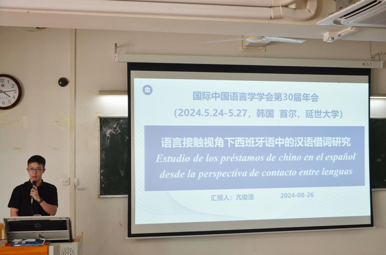 最后,亢俊洁老师分享了他在韩国参加“国际中国语言学学会第30届年会”时提交的研究成果《Estudio de los préstamos de chino en el españ������ol desde la perspectiva de contacto entre lenguas》。他介绍了在经济全球化时代,西班牙语词汇通过与其他国家接触日益国际化,汉语借词虽贡献不如印欧语系语言,但在西班牙语中也占有一席之地。亢俊洁老师采用定性和定量相结合、语料库分析等研究方法,对汉语借词在西班牙语中的语音、语义和语法变化进行了深入探讨,并分析了这些变化的原因以及社会因素和语言因素对于汉语借词的影响。此外,他还提出了未来的研究方向,包括对比研究、关注汉语借词在西语国家的传播和接受情况等。他认为,汉语借词作为汉文化符号,能够让中国更好地走进西语世界,让西语世界更了解中国。
