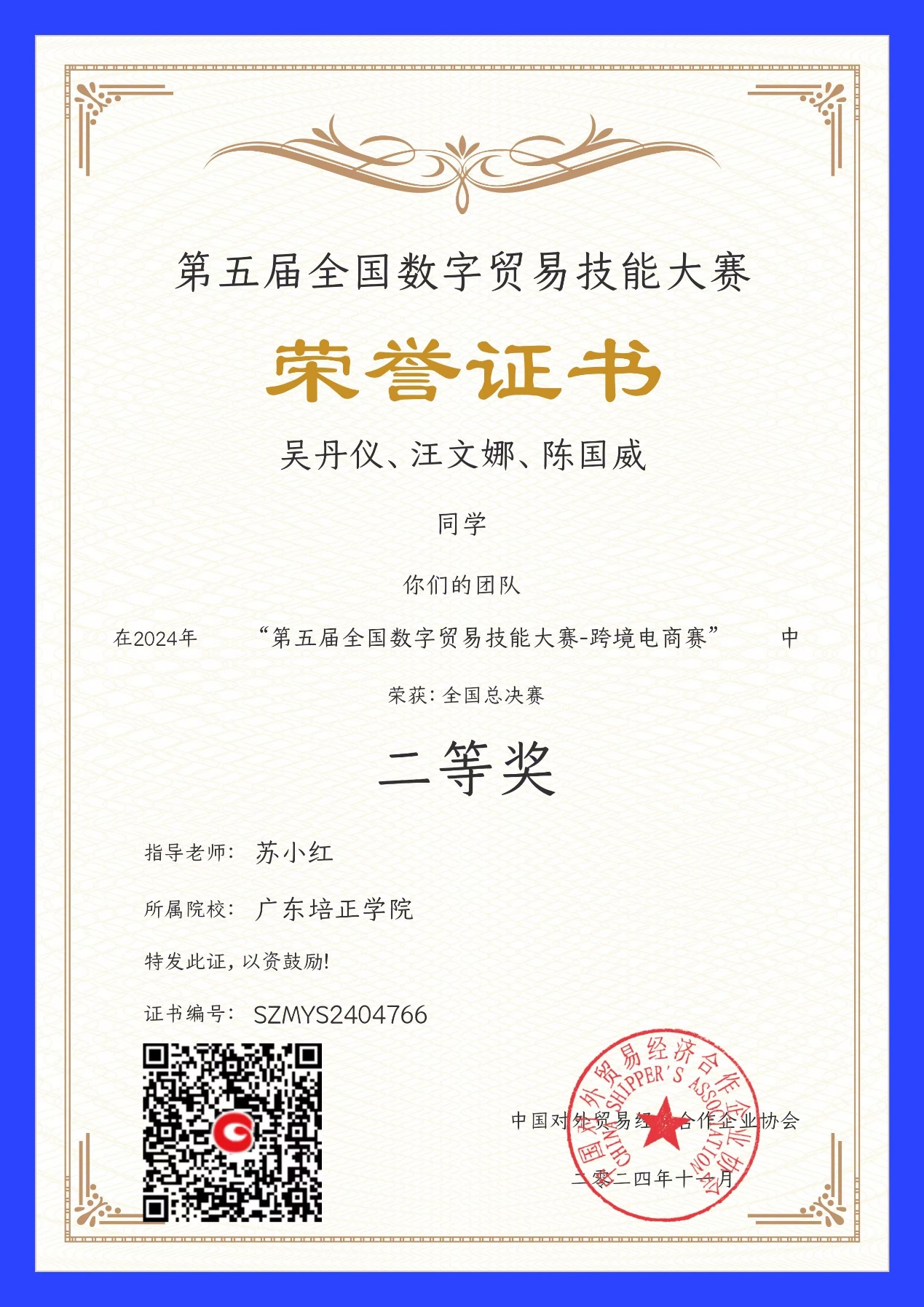 本网讯 (外国语学院 苏小红)第五届全国数字贸易技能大赛-跨境电商赛于11月24日落下帷幕,外国语学院英语专业2022级学生吴丹仪、汪文娜、陈国威组建的从容应队以及林婷婷、邱佳佳、蓝锦欢贸易新航线队,凭借扎实的理论基础、出色的实践能力和创新的解决方案分别荣获二等奖和三等奖。