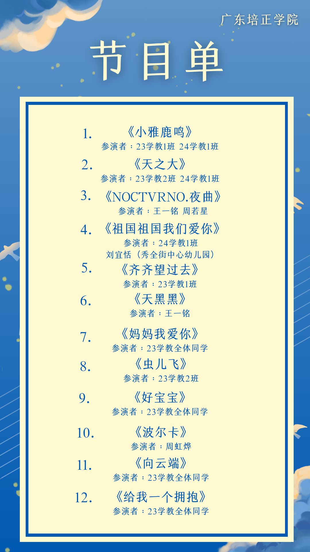 本次音乐会作为学前教育专业声乐“混合式教学”课题的结项展示,充分展现了“混合式教学”模式的独特魅力和显著成效。音乐会内容丰富多样,既有经典声乐作品的深情演绎,也有结合现代元素的新颖创作,充分体现了学前教育专业学生在声乐学习上的全面进步。