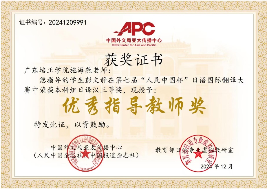 本网讯 (外国语学院 孟南柯)外国语学院日语专业学生在2024第七届“人民中国杯”日语国际翻译大赛中获得佳绩,其中彭文静等4名同学获三等奖奖项5个,郑科鑫等4名同学获优秀奖奖项5个,施海燕等5名老师获得“优秀指导教师”称号。