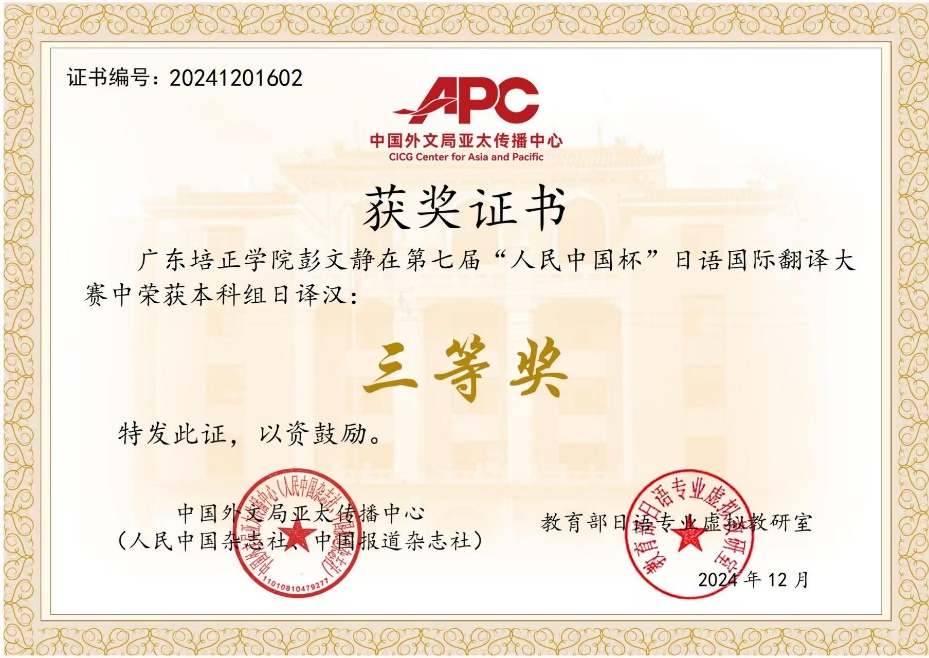 本届“人民中国杯”日语国际翻译大赛共700多所高校/企事业单位的近万名选手参与,一直以来都是全国广大日语学习者相互交流和切磋的大型平台,在如此激烈的竞争下,我院学生可以脱颖而出,创下佳绩,可喜可贺。