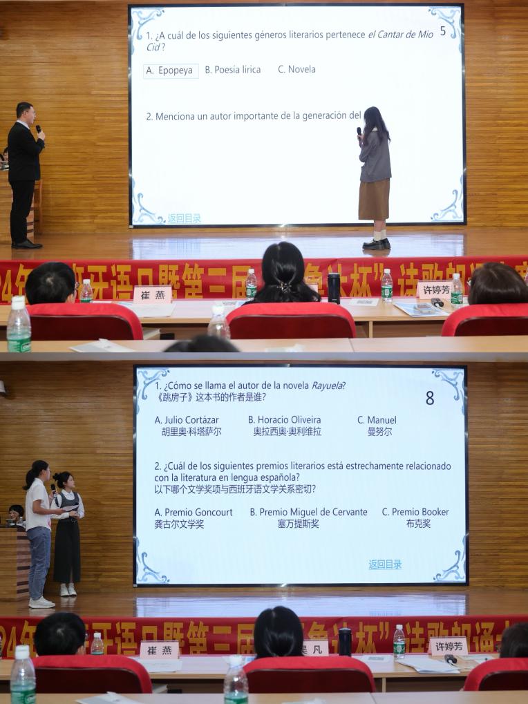 在每组选手朗诵完毕后,还设置了西班牙语文学常识题环节。这一环节不仅考验了选手们对西班牙语文学知识的储备,也让观众们在聆听诗歌朗诵之余,进一步了解了西语文学的深厚底蕴。主持人提出问题后,选手们迅速思考,沉着应答。有的选手对答如流,展现出了扎实的文学功底,赢得了观众们的钦佩;而有的选手虽然稍显犹豫,但也能在短暂思考后给出较为准确的答案,他们的努力同样值得肯定。这个环节让整个比赛更加丰富多元,也让大家对西语文学有了更全面的认识和感悟。
