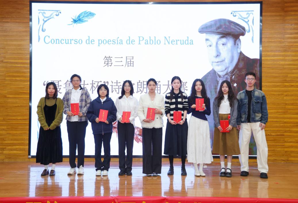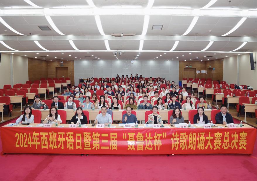 本网讯(外国语学院 亢俊洁)为了进一步促进广东省内高校西班牙语系师生的互动与学术探讨,激发对西班牙语文学的热爱,提升语言感知与表达能力,广东外语外贸大学于2024年12月5日14:00-17:30,成功举办了第三届“聂鲁达杯”诗歌朗诵大赛。