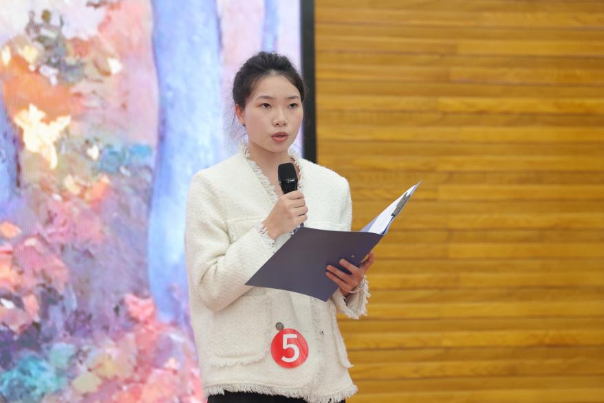 比赛在众人的翘首以盼中拉开帷幕,率先登场的是二外组的选手们。他们虽来自不同的专业背景,但对西语诗歌的热爱却毫无二致。我校二外组参赛选手是来自翻译系的学生冯金玲,她身着一件白色的职场精英外套,修身的版型将她纤细而挺拔的身姿完美勾勒,她那一头乌黑的长发被高高盘起,几缕碎发俏皮地垂落在脸颊两侧,眉如远黛,双眸明亮而深邃,宛如静谧的深潭,却又在不经意间透露出灵动与聪慧。她在朗诵过程中,巧妙地用眼神与观众交流,将诗中的细腻情感缓缓传递,每一个停顿、每一次语调的起伏,都仿佛在诉说着自己与这首诗相遇相知的故事。