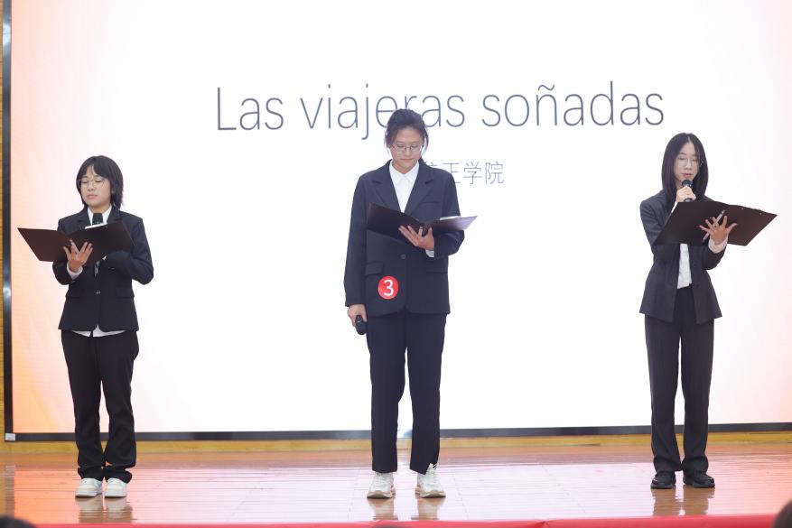 紧接着,专业低年级组的选手们闪亮登场。我校低年级组参赛选手是2023级的成心仪、向远辉和2024级何臻。她们身着黑色西装,流畅的西服线条凸显其沉稳大方,赋予她们一种独特的英气,好似三朵能迎接任何挑战的铿锵玫瑰。当朗诵开始,她们将聂鲁达诗歌中的优美意境徐徐展开。她们巧妙地运用表情和肢体语言,在描述诗中的景象时,微微仰头,似在仰望诗中的星辰;轻抬手臂,仿佛在触摸那遥不可及的诗意远方。她们声音坚定而有力,每一个音节都像是一颗燃烧的火种,点燃了诗中的激情与力量,将聂鲁达诗中的恢宏磅礴之势展现得淋漓尽致。