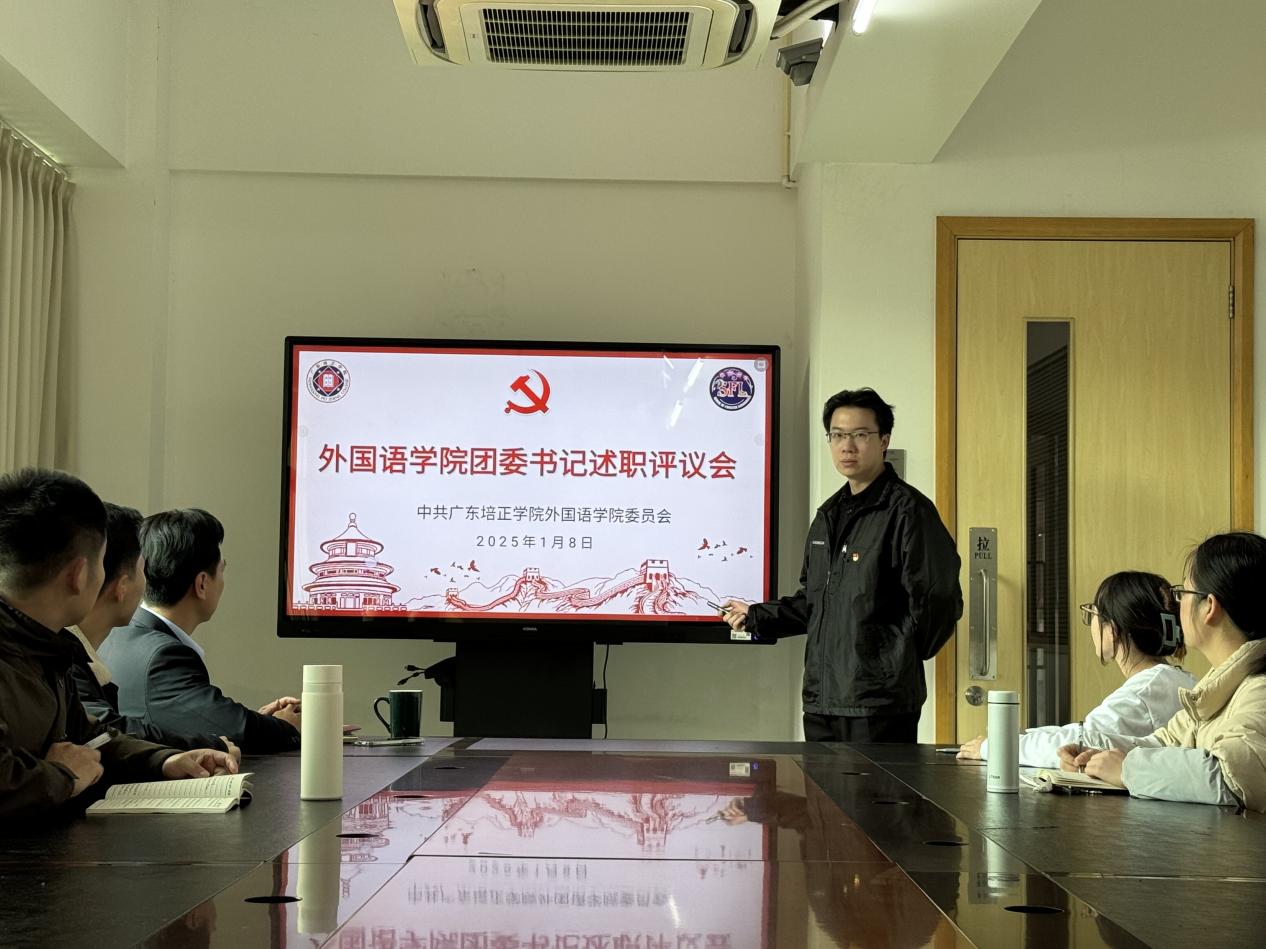 本网讯(外国语学院 谢昭鸿)为进一步加强党建带团建,扎实推进全面从严治团向基层延伸,提升青年学子的思想政治素质与全面发展,2025年1月8日,外国语学院在2410会议室召开团委书记述职评议会。外国语学院党委书记陈橹,党委组织委员钟俊尧,学生党支部书记黄斯旋、谢树明、吕嘉欣到场参加会议。
