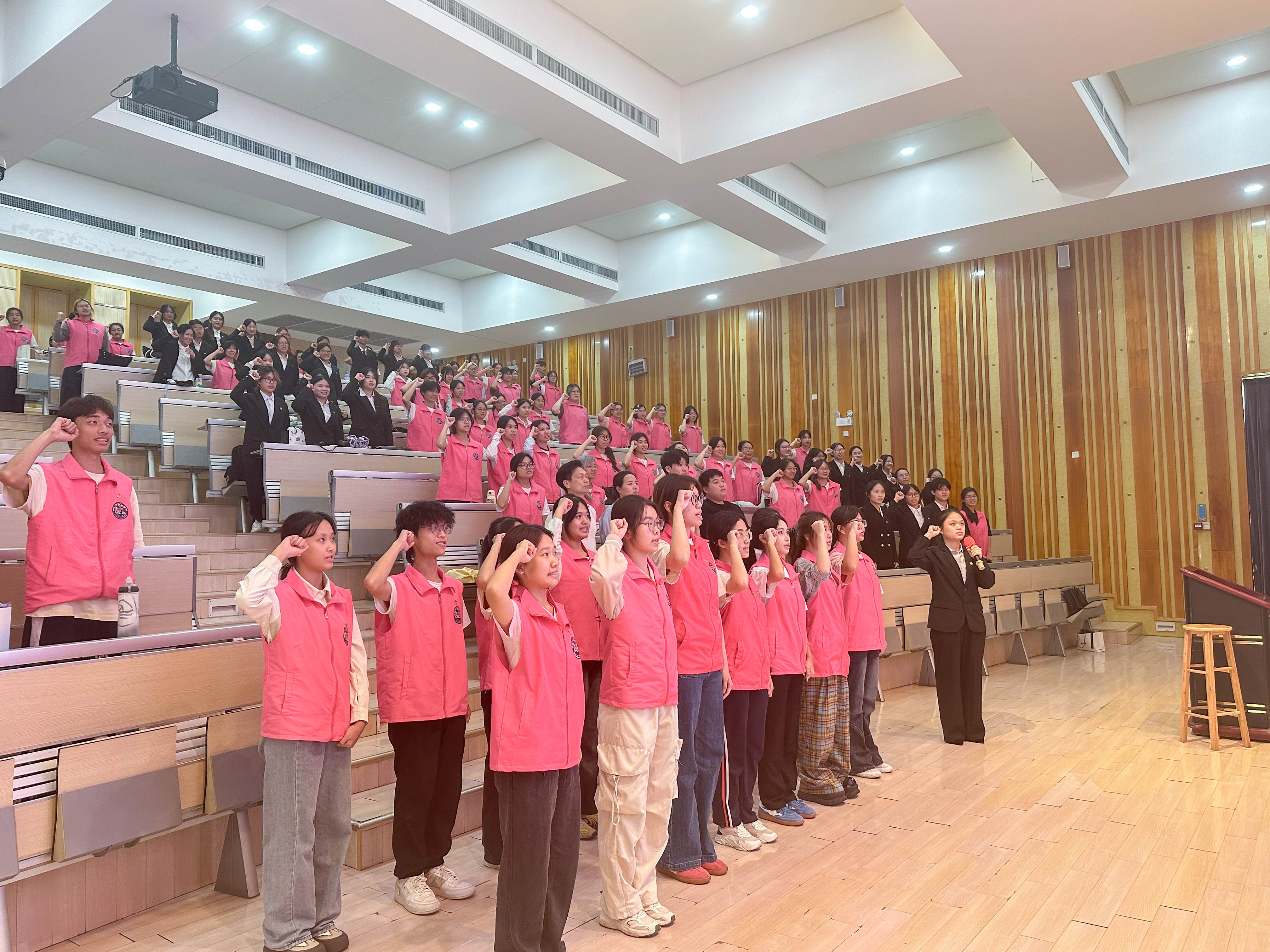 大会第六项,第十四届外国语学院团委、学生会的新干事代表进行宣誓。由庞蓓蔚师姐带领小伙伴进行庄严的宣誓。相信大家在宣誓时一定会心潮澎湃,希望大家往后的日子里不忘来路,勇敢奔赴新程。