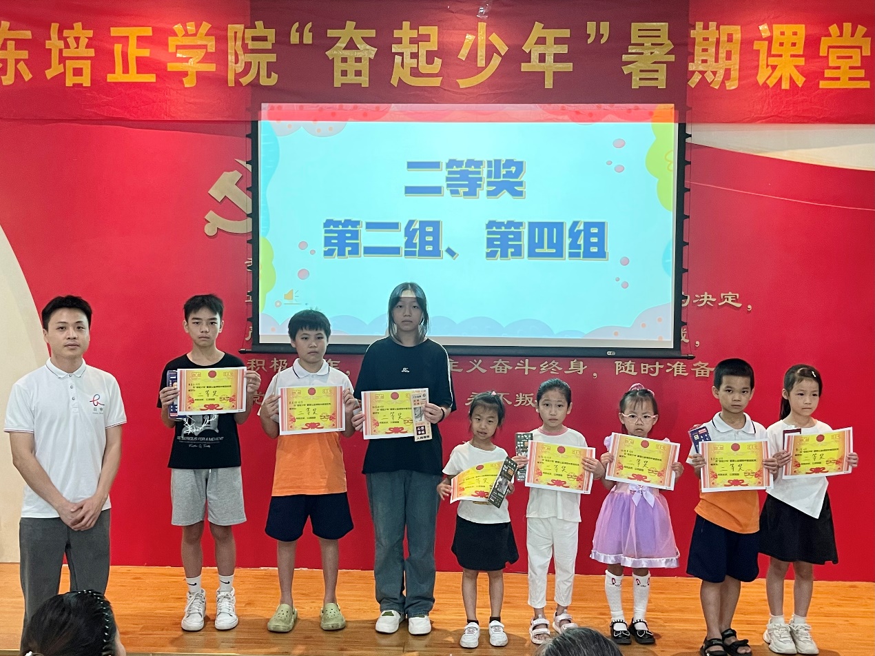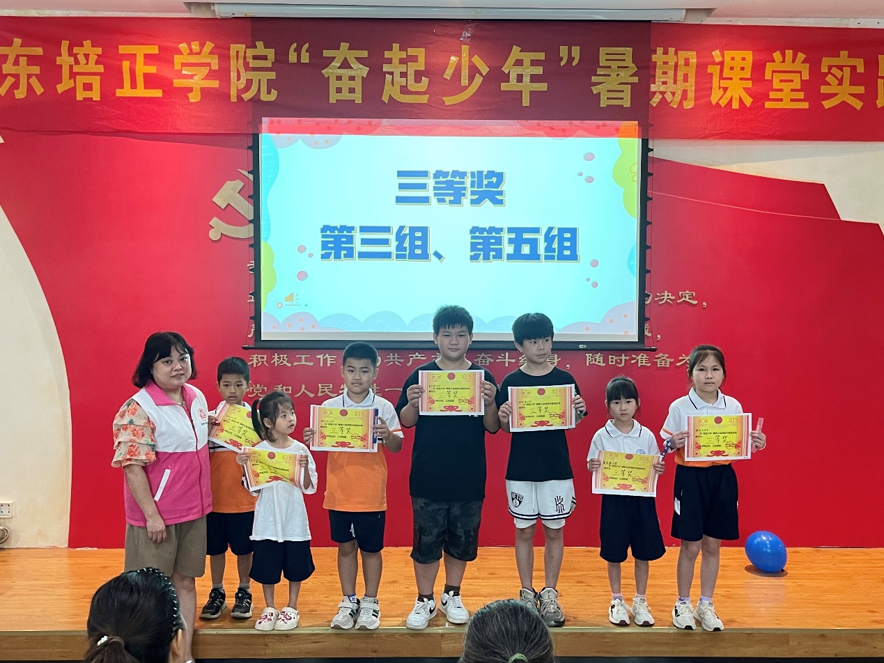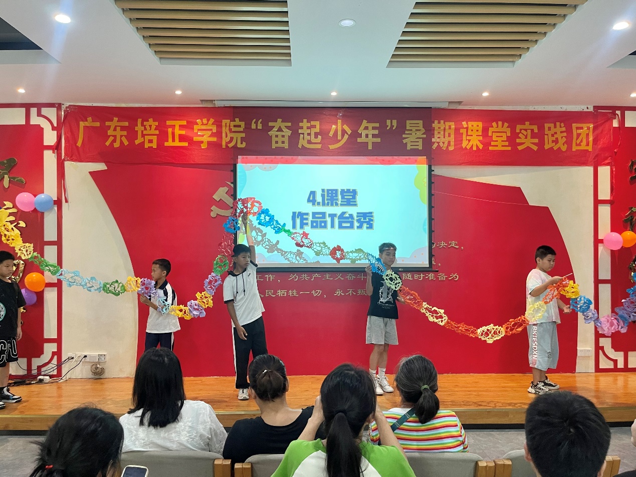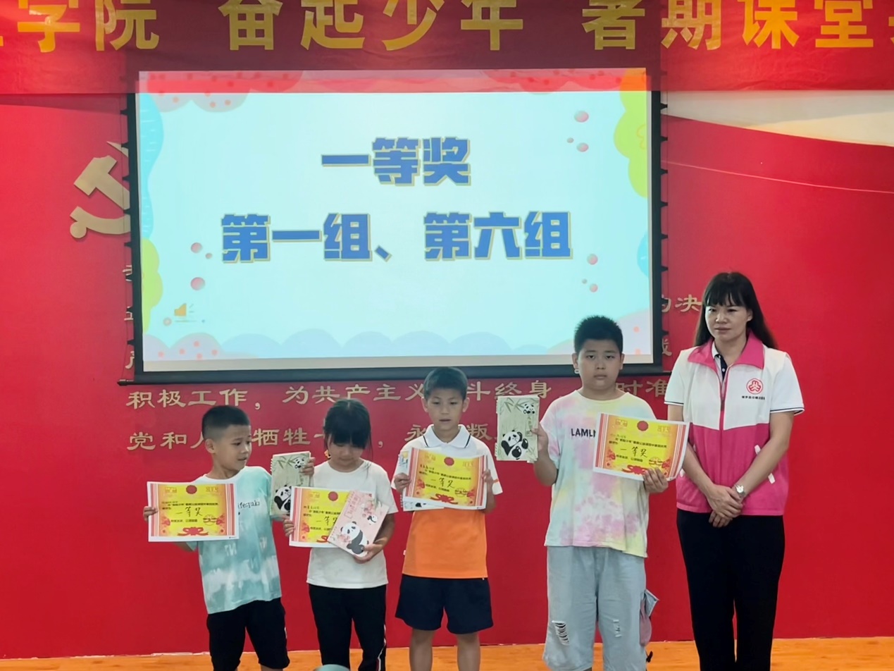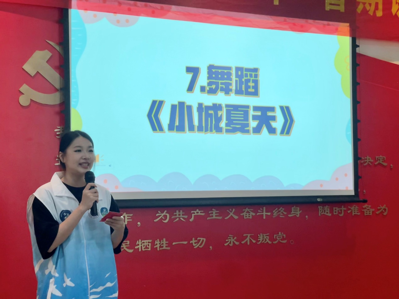 青春风华正茂,稚气别有风格。07月24日,在“奋起少年”们的共同努力下,文艺汇演如期举行并圆满结束。出席文艺汇演的嘉宾有新江村党支部书记兼村委会主任黄邵源同志、长宁镇妇联代表叶秀婷同志、长宁镇团委代表林博兴同志、新江村妇联主任张巧玲同志等当地领导,以及“奋起少年”百千万工程突击队指导老师黄斯旋同志与朱丽婷同志。主持人赵晓旭同志和刘璇同志介绍了本次文艺汇演的流程:播放宣传视频、正式表演、颁奖仪式以及指导老师黄斯旋同志发言。