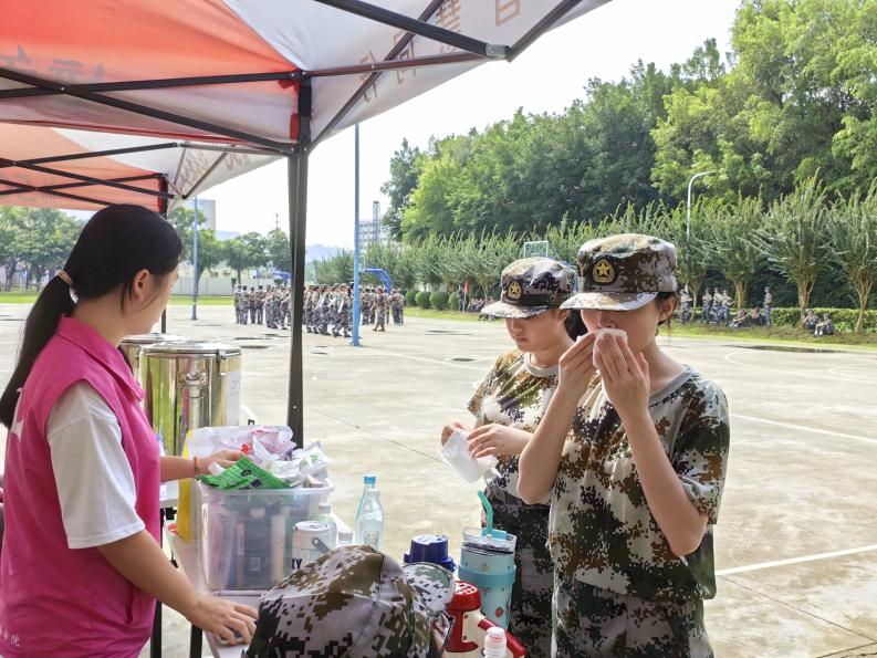 清晨的八点,志愿者们便已开始忙碌起来。他们在外国语学院的“军训补给小驿站”蓄势待发。随着军训的进行,志愿者们更是化身成了“多面手”。他们有的准备好凉茶,为汗流浃背的同学们递上清凉;有的则守在医药箱旁,随时准备为受伤的同学提供及时的帮助。