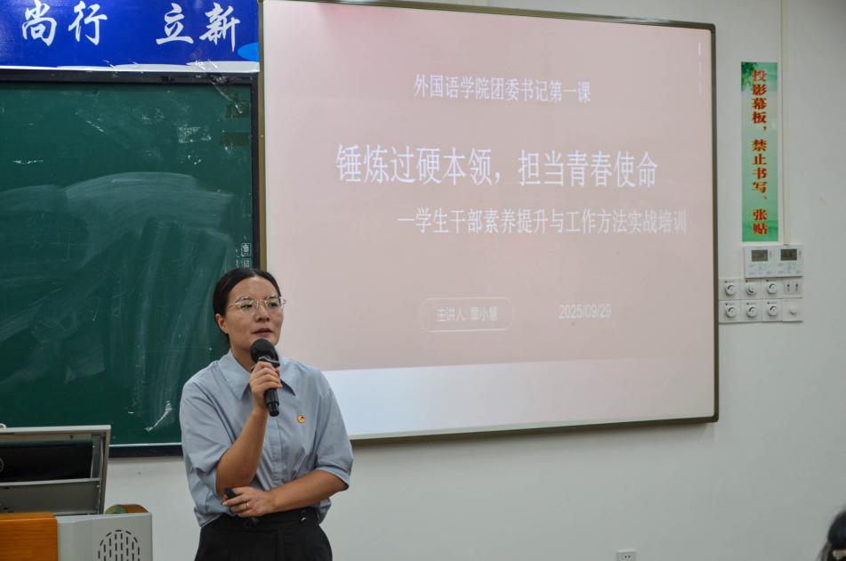 本网讯(外国语学院庞蓓蔚【学生】)为提升外国语学院团委学生会干部的综合素养与工作能力,更好地担当青春使命、服务同学成长,2025年9月30日,外国语学院团委书记兼学生会指导老师章小慧老师于5-308开展“团委书记第一课”——外国语学院学生干部素养提升与工作方法实战培训。培训围绕学生干部身份认知、核心能力锻造两大维度展开,为学生干部们指明了成长方向与工作路径。