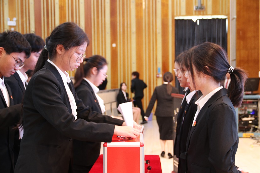 紧接着,学生代表通过举手表决,先后审议表决了《广东培正学院外国语学院学生会章程(修正案)》、《广东培正学院外国语学院第九次学生代表大会委员选举办法(草案)》和广东培正学院外国语学院第十次学生代表大会总监票人、监票人、总计票人、计票人名单,并且以民主投票的形式,选举产生广东培正学院外国语学院新一届学生委员。