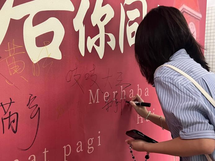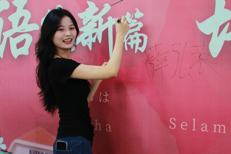报道室外,一面别具一格的签名墙格外吸睛。新生们在墙上郑重签下姓名,还在镜头前与外院吉祥物“战小鹰”同框,留下专属影像。一个个字符、一张张满是青涩的照片,既是与学院初遇的珍贵纪念,也是青春迈向新征程的第一枚鲜活印记。