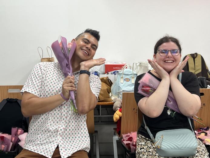 晨光初洒,迎新休息室已迎来几位外教的身影。他们用流利的英文、热情的态度向新生致以热忱祝福,将馥郁鲜花递到新生手中,快门声里定格下跨文化的亲切瞬间;用英文交流学院日常,轻声细语间,让陌生与不安消散在温暖的跨国对话里。
