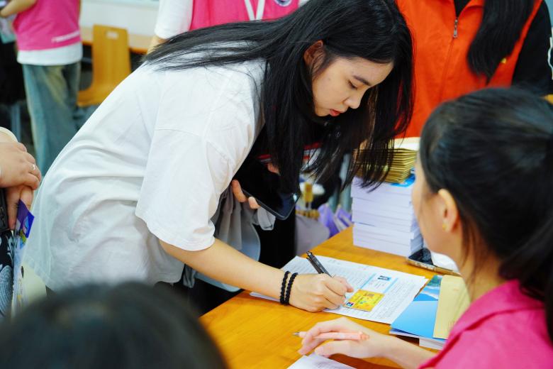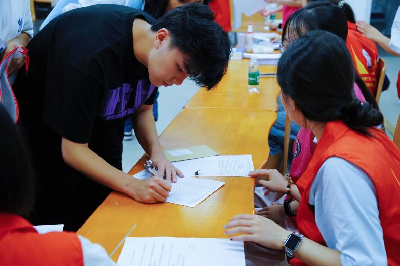 迎新志愿者于5教214、215教室协助新生耐心地为新生办理入学手续,新生信息采集、核对新生资料信息,收取通知书及派发银行卡等,每一步都细致入微。
