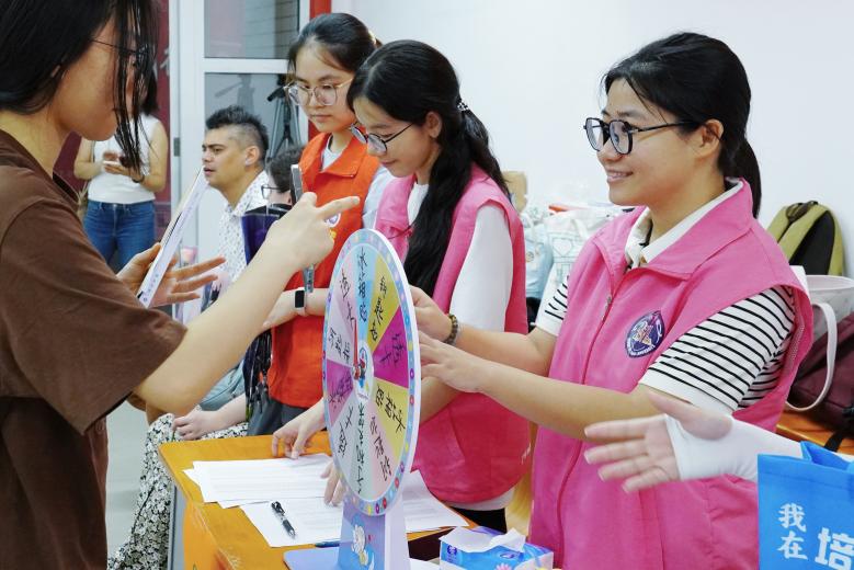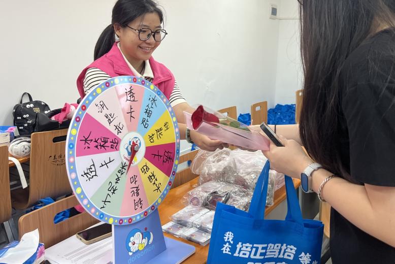 休息室内,桌面上摆着一轮可爱的转盘,上面写着为外院萌新们准备的见面礼:定制手机支架、定制透卡、外院吉祥物钥匙扣以及校徽冰箱贴,每一份都饱含着对萌新的祝福。外院萌新们兴致勃勃的转动转盘,解锁专属定制的精美礼品。