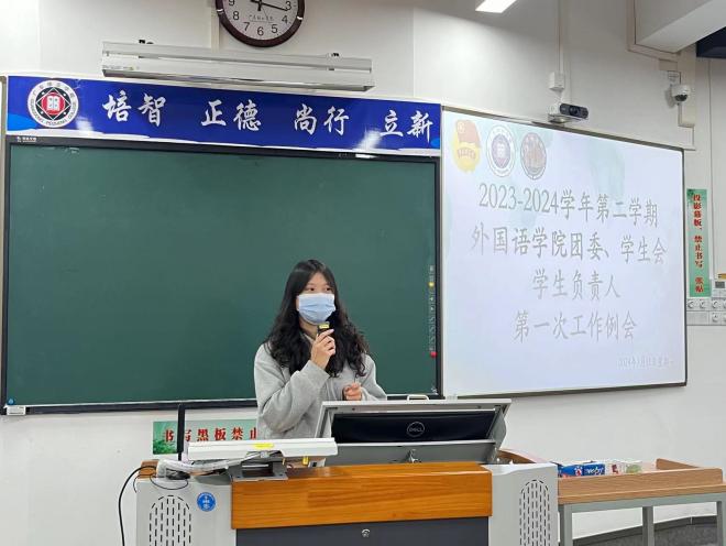 外国语学院团委、学生会全体学生负责人参加会议,本次会议由外国语学院团委副书记兼学生会执行主席朱文琦师姐主持。