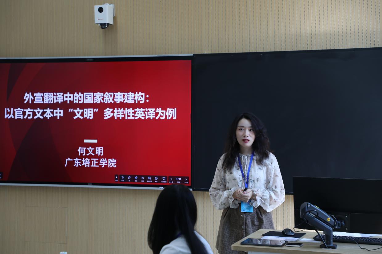外国语学院副教授何文明在国际传播分论坛3宣讲论文,题目为《外宣翻译中的国家叙事建构:以官方文本中“文明”多样性英译为例》。她指出,国家形象是国际话语权争夺的核心,外宣翻译是中国价值观传递、实现“自我表述”的战略实践。通过翻译策略重构“文明”等概念,可回应西方偏见,展现全面中国形象。外宣翻译正迈向意义共鸣,激发文化共情,助力中国故事融入国际生活。