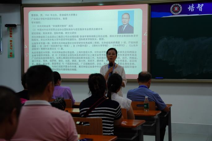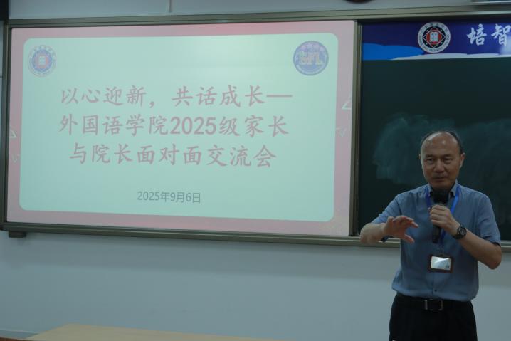 交流会伊始,曹德春院长代表学院致欢迎辞并发表讲话。曹院长从宏观视野和学院实际出发,深入分析了当前国内外外语教育发展的新形势、新机遇与新挑战,为各位家长系统介绍了外国语学院各专业的办学特色、建设成效与发展愿景。曹院长重点就学院师资队伍建设、外籍教师配置及国际化办学资源等方面进行了重点说明,全面展示了学院雄厚的办学实力与鲜明的培养特色。曹院长的讲话内容详实,有效增进了新生家长对子女所学专业的内涵认知、课程体系及未来发展前景的全面了解,为家校协同育人奠定了坚实基础。